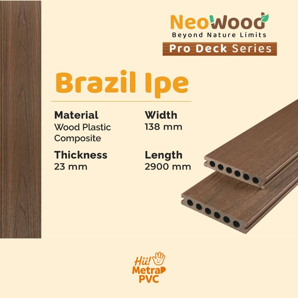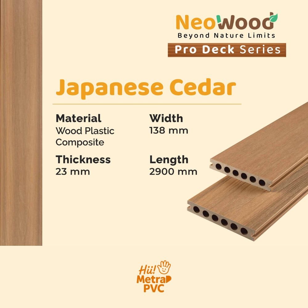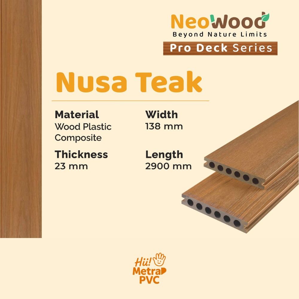 Dengan kombinasi desain natural kayu dan material Wood Plastic Composite berkualitas tinggi, Neowood Pro Deck Series menjadi pilihan tepat untuk decking taman, teras, balkon, kolam renang, maupun area outdoor lainnya. Tahan cuaca, anti rayap, dan minim perawatan.
